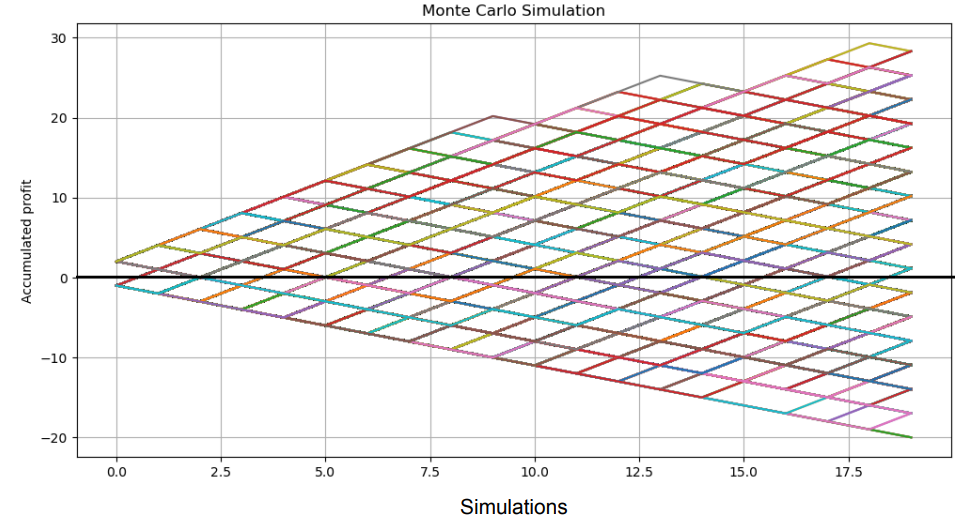 In the example below, you can see the most likely result for this low risk setting is a monthly return of 7%. That would be at 1% risk. At 2% risk the gain would be 14%, at 3% risk the gain would be 21% and so on.
